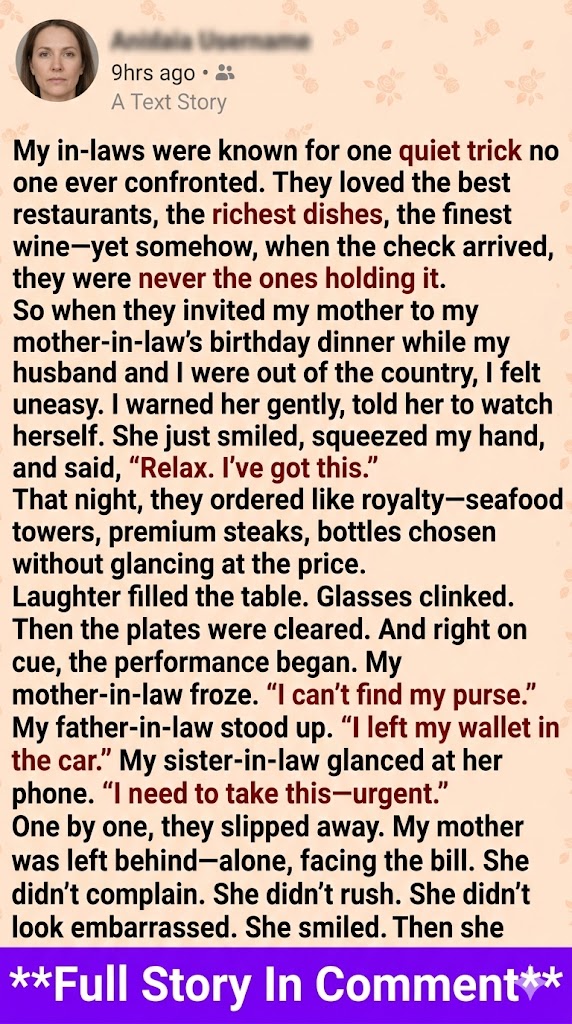 So when they invited my mother to my mother-in-law’s birthday dinner while my husband and I were overseas, I felt uneasy. I warned her carefully, reminding her of their habits and telling her to stay alert.