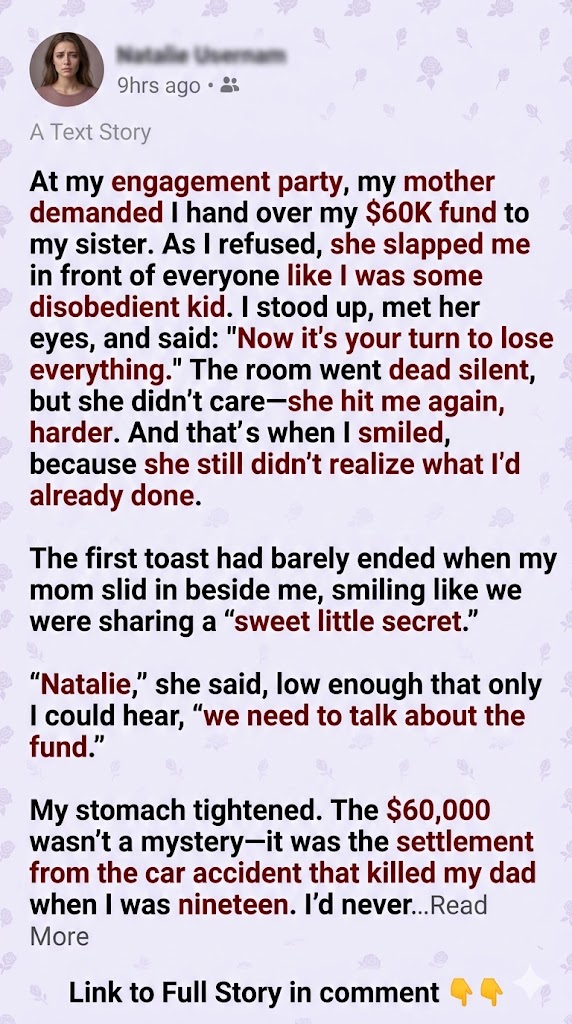 At my engagement party, my mother cornered me and demanded I hand over my $60,000 fund to my sister. When I refused, she slapped me in front of everyone like I was a misbehaving child. I stood tall, looked her straight in the eye, and said, “Now it’s your turn to lose everything.” The room fell silent—but she didn’t hesitate. She struck me again, harder. And that’s when I smiled, because she still had no idea what I’d already put in motion.