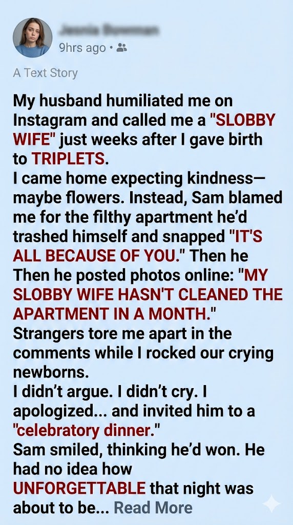 The first thing my husband said after I gave birth to triplets wasn’t “Welcome home.” It was: “You could’ve given birth faster.” He blamed me for the disgusting mess he’d been living in — and posted it on Instagram to humiliate me. So I used his little post to plan a night he’d never forget!