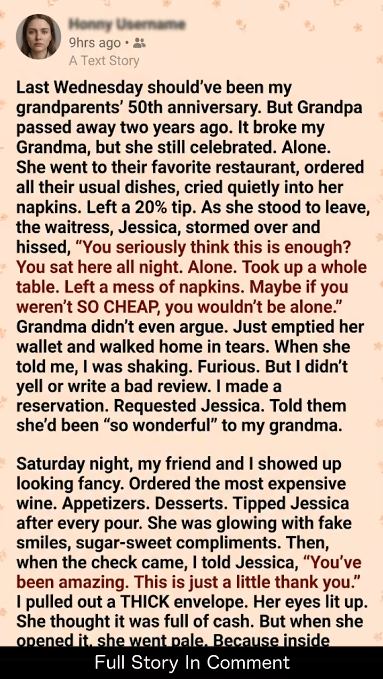“This is the money you bullied out of my grieving grandmother on her 50th anniversary. You told her she deserved to be alone. Keep the money. It’s the last tip you will ever earn here.”