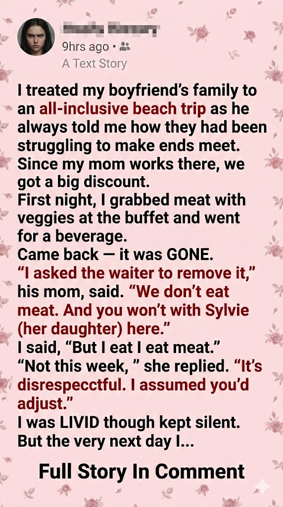 “But… I eat meat,” I repeated, my voice rising in disbelief. “I planned on eating meat on this trip.” His mother’s smile vanished completely. “Not this week,” she stated firmly. “It’s disrespectful to eat meat in front of us, especially Sylvie. I just assumed you would adjust your diet accordingly. It’s the least you can do, considering we are your guests”. My mind was reeling. She [“ASSUMED I WOULD ADJUST MY DIET”]. The audacity of this woman was breathtaking. I had paid for this vacation! How dare she dictate what I could and couldn’t eat?
