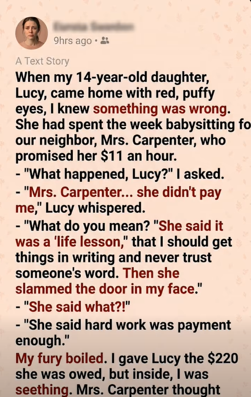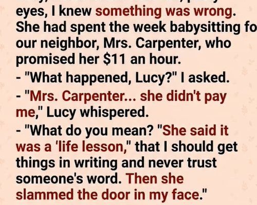 Mrs. Carpenter avoided making eye contact with us for months. And funnily enough, a neatly sealed envelope containing exactly $220 in cash appeared in our mailbox the very next afternoon. I let Lucy keep it as a bonus. After all, she earned it.