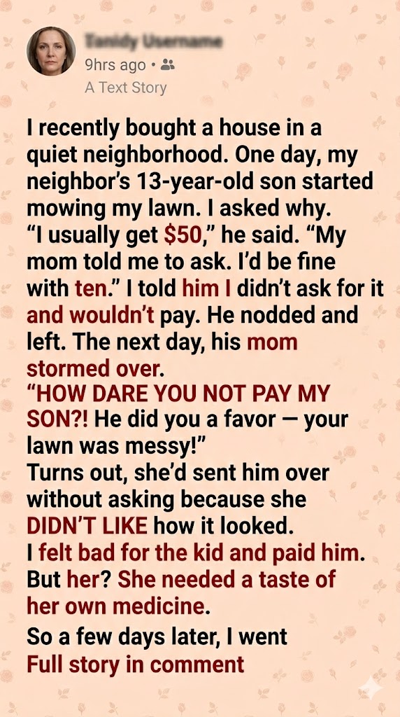 “HOW DARE YOU NOT PAY MY SON?!” she shrieked, her voice echoing through the quiet neighborhood. “He did you a favor! Your lawn was a mess!” I was stunned. Apparently, she had sent her son over to mow my lawn without my consent, simply because she didn’t like how it looked. She expected me to pay for a service I hadn’t requested, a service that was, in her mind, a personal favor to me. I felt a pang of sympathy for her son, caught in the middle of his mother’s bizarre scheme.