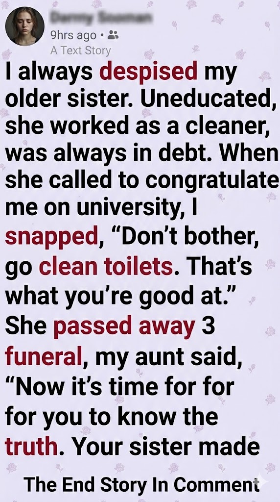 “She never got a proper education or a good job because she wanted you to have it all,” my aunt said softly. “It was a family secret. She forbade everyone from telling you. She said if you knew, you’d feel pressured. Or guilty. She wanted you to succeed freely.”