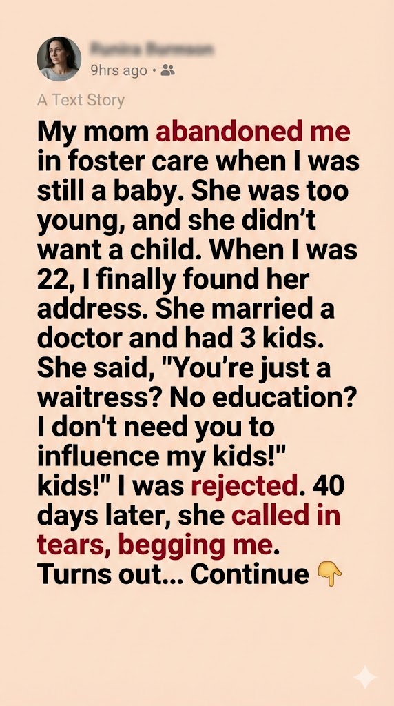I don’t remember the day my mother left me. I was too small—just a baby handed over to strangers, a name on a file, a quiet bundle placed into foster care because the woman who gave birth to me was too young and too afraid to keep me. That’s what I was told later, anyway.