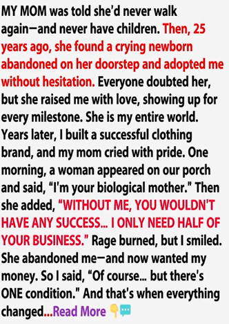 “Sweetheart, you do realize that without me, you wouldn’t have any success, right?” she said. “I’m the one who made sure you were raised by this woman so you’d turn out well. I only need half of your business. That’s fair.”