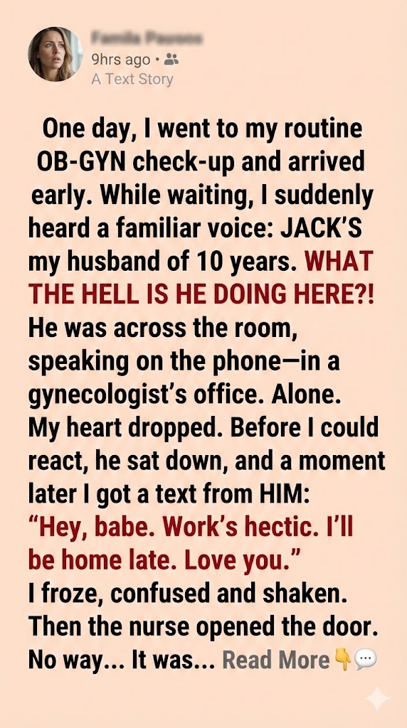 I was in the hospital waiting room for my annual OB-GYN checkup when I heard a familiar voice. My heart froze. Just a few seats away sat my husband, Jack, speaking quietly on his phone. What was he doing there?