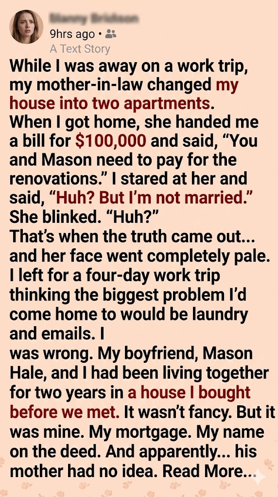 My stomach dropped. “You signed a $100,000 contract… on a house you don’t own… while I was out of town?”
