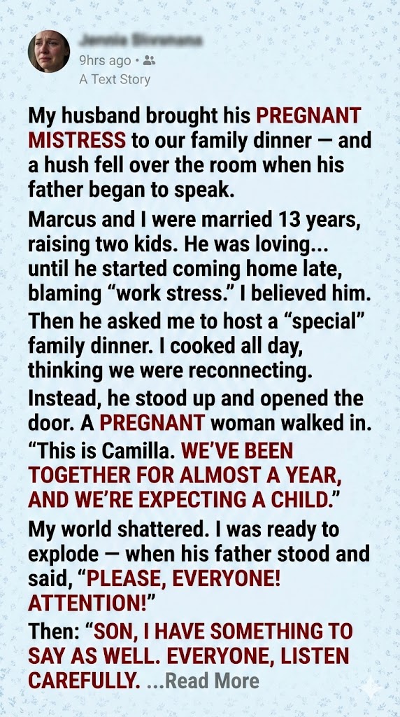 And that’s when the pain really hit me, not just from the betrayal but from the audacity. The casual cruelty of bringing her here and turning our family dinner into his big reveal.