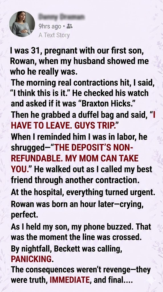 “Text me your contraction times,” she said. Her voice went flat and focused. “I’m leaving work right now. Do not drive. Do not wait for his mother.”