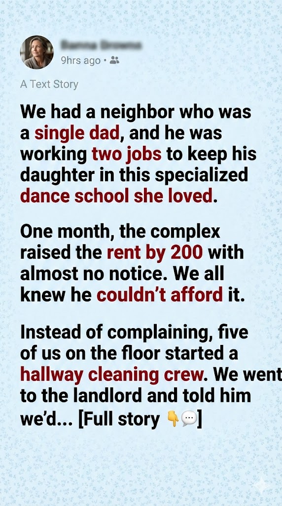 We went to his office together—five ordinary tenants with tired eyes and work-worn hands—and made him an offer. We’d take over hallway cleaning. Stairwells. Trash areas. Lightbulbs. Minor maintenance. Every floor, every week.