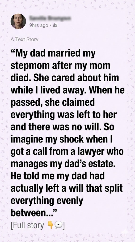 I always thought my relationship with my dad was special. Different from others. He wasn’t perfect, no dad is, but he was my dad. And when he married her, I tried. I really did. She was kind, in her own way. Always there. Especially when his health started to fail. She’d cook his meals, manage his meds, drive him to endless appointments. I saw it, I appreciated it, I truly did. But she was still just… her. My stepmom. Not my mother, not my friend. Just the woman who shared his last decade.