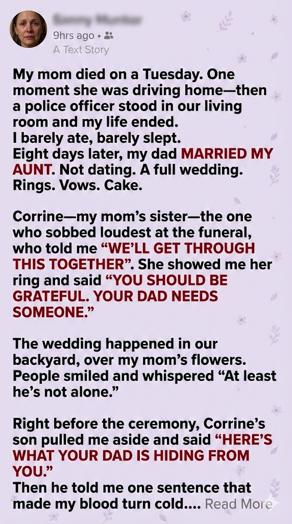 Eight days after my mother’s death, my dad married her sister. While guests clinked champagne and smiled for photos, I was behind the shed, hearing a truth that shattered everything. It started with one whispered sentence, and ended with a secret they never expected me to uncover.