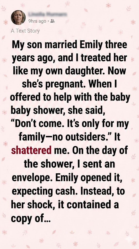 Emily opened it, expecting money. Instead, to her shock, there was a copy of the will I had intended to share—detailing a six-figure trust I had planned to create for their baby. But across the bottom, in my handwriting, I had added: ’Consider this void.