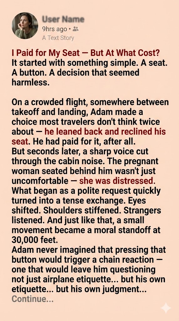 The dilemma of reclining your seat fully on a flight is a common one—should personal comfort take priority over the comfort of others? When Adam chose to recline his seat, the pregnant woman sitting behind him voiced her discomfort, sparking an unexpected chain of events that left everyone unsettled. Here’s his story.