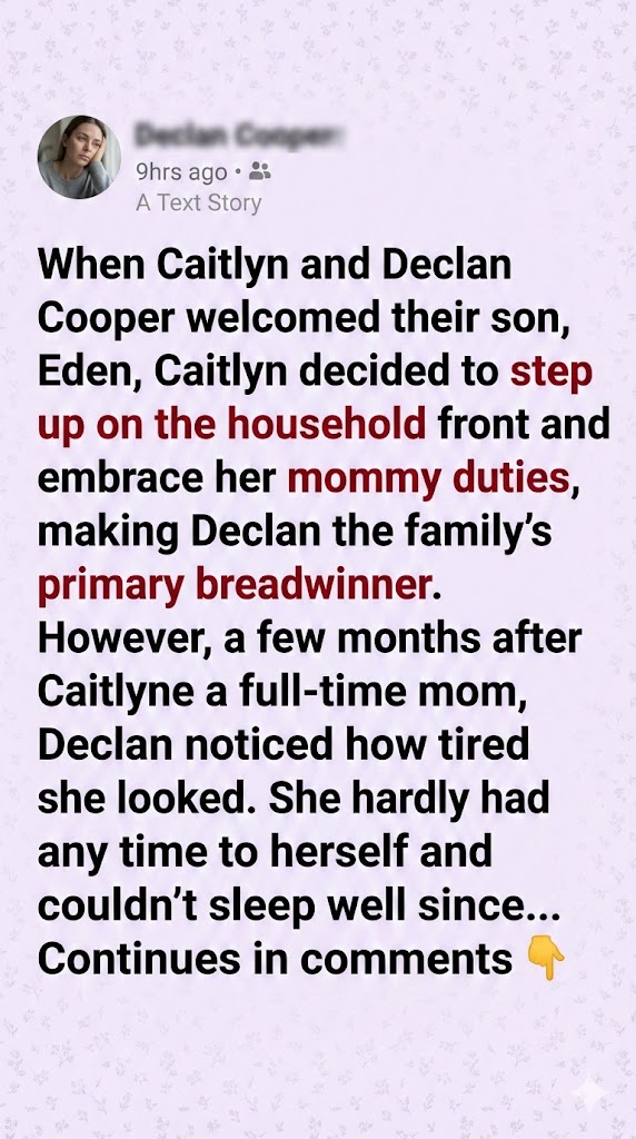 But within months, Declan noticed how exhausted Caitlyn looked. Sleepless nights, endless baby duties, and the loss of personal time had drained her energy. She barely recognized herself anymore. Declan knew she needed a break, even if she didn’t think so.