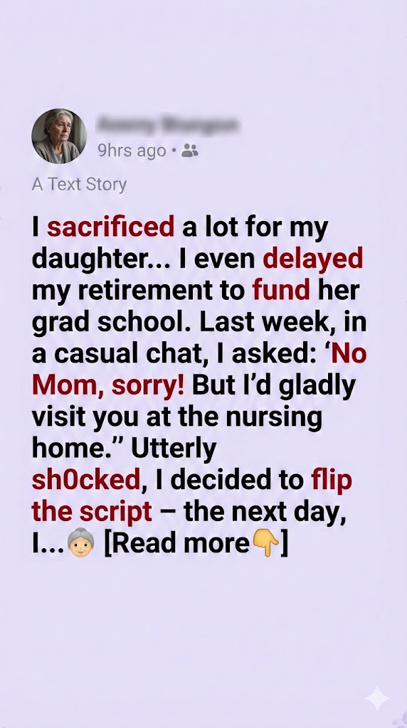 I tried to clarify, told her I never meant she’d have to change my diapers—I just hoped for some support. Even emotional. She doubled down: “No, Mom. The cycle of parental sacrifice doesn’t have to continue forever. I didn’t ask for it.” Then she chuckled and added, “But hey, I’d totally visit you at the nursing home!”