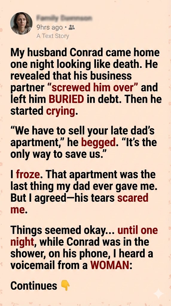 I never imagined it would be Conrad—until the night he came home pale and trembling. He said his business partner had “screwed him over” and left him buried in debt. His voice broke as he pleaded, “We’ll lose everything unless we sell your dad’s apartment.”