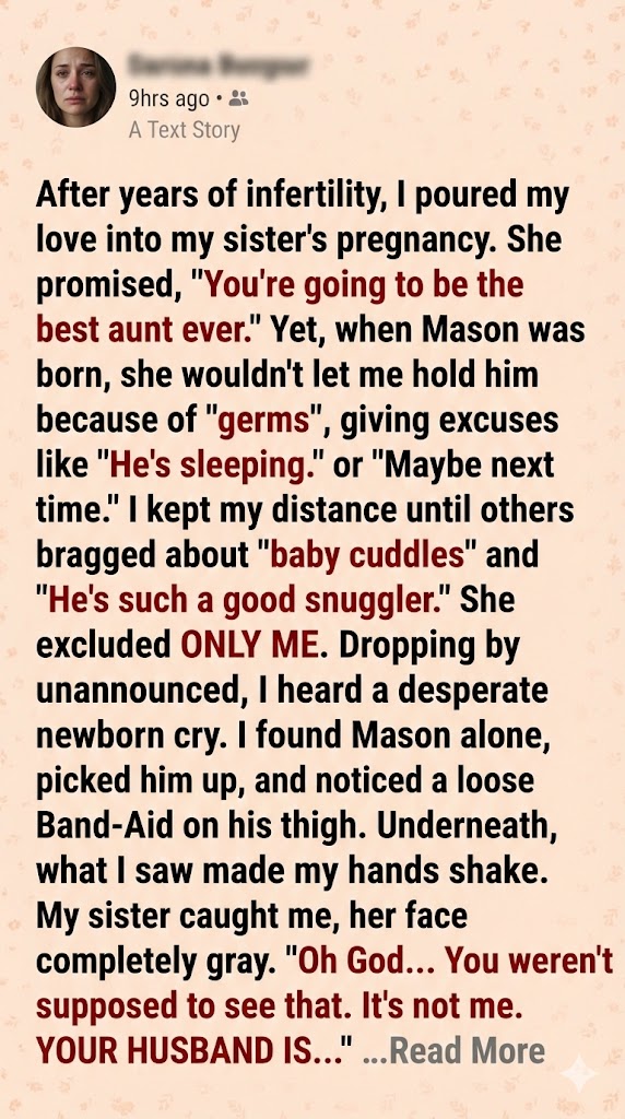 My sister wouldn’t let me hold her newborn for three weeks, while everyone else got baby cuddles. Then I walked in unannounced, heard Mason screaming alone, and picked him up. The Band-Aid on his thigh was peeling, and the second I lifted the corner, my sister came running, begging me to stop.