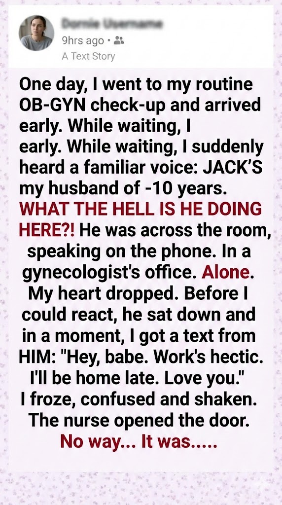 I was in the hospital waiting room for my annual OB-GYN checkup when I heard a familiar voice. My heart froze. Just a few seats away sat my husband, Jack, speaking quietly on his phone. What was he doing there?