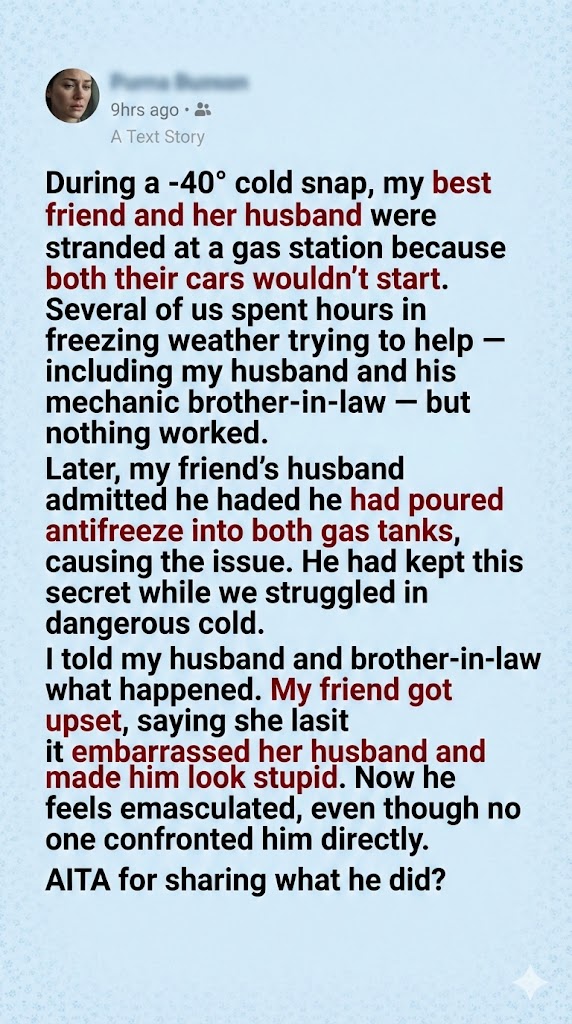 Yesterday I (36 F) got a frantic call from my best friend (36 F). She says that both she and her husband (35 M) were stuck at the gas station because both cars wont start. While this sounds unrealistic to some, this is in a northern state during an arctic blast of -40° cold front. Batteries stop working in that kind of cold. My friend tells me that her husband called her to come give him a jump, and when she got there and tried to jump his car, hers suddenly shut off and then wouldn’t start.