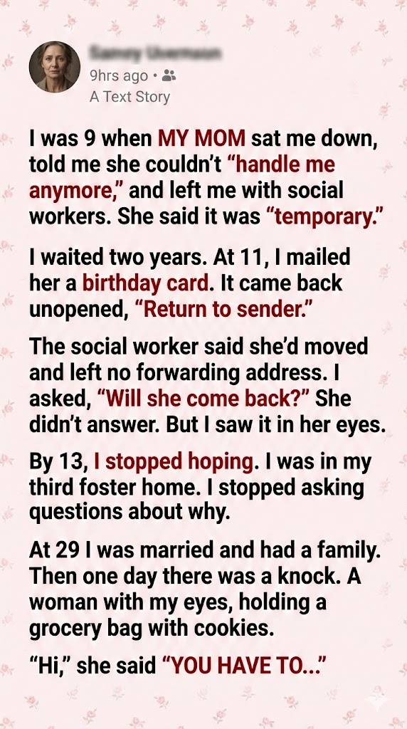 Twenty years after my mother walked out of my life, she appeared at my door with nothing but a grocery bag and demands. What she said next shattered everything I thought I knew about forgiveness.