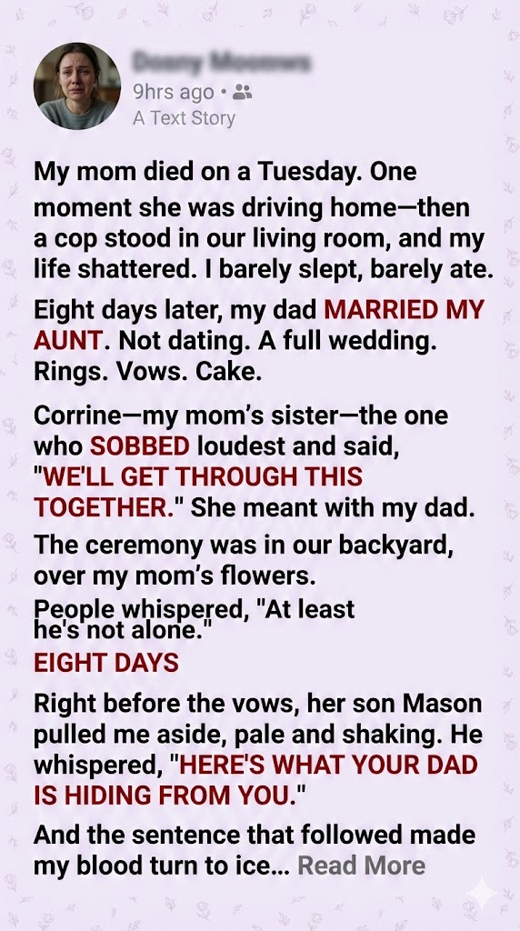 Eight days after my mother’s death, my dad married her sister. While guests clinked champagne and smiled for photos, I was behind the shed, hearing a truth that shattered everything. It started with one whispered sentence, and ended with a secret they never expected me to uncover.