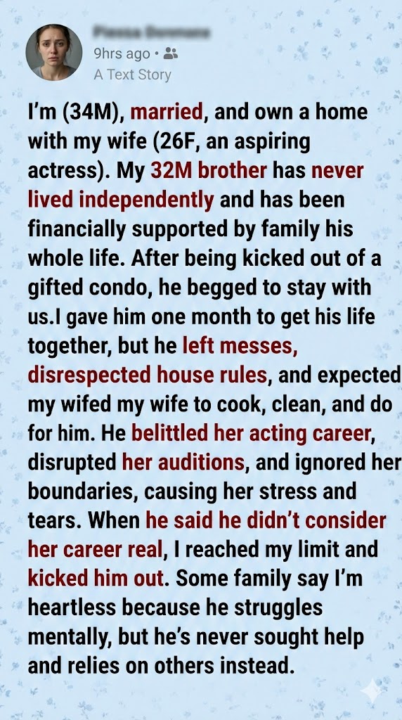 she finally got a good agent, her auditions she gets are huge and she is on cloud 9. as soon as he started doing this I noticed she was getting stressed, one of the main issues is he works nights.. he was there all day while I was at work and if she asked him to be quiet he did not care. he said he didn’t consider it a career and he didn’t think she’d make it so he didn’t feel the need to care. as if her making it or not changed anything about it being her home, and her dreams. if I was home and told him to shut up, he would. however during the day he did not listen to her and made her cry. That was the day I told him to get out, he’s had enough free passes. its time to grow up. my other brothers got mad, said I’m heartless because he’s struggling mentally… but the guy has been struggling mentally since he was 16 and has never attempted therapy, meds, anything. he just cries and relies on everyone to do everything.