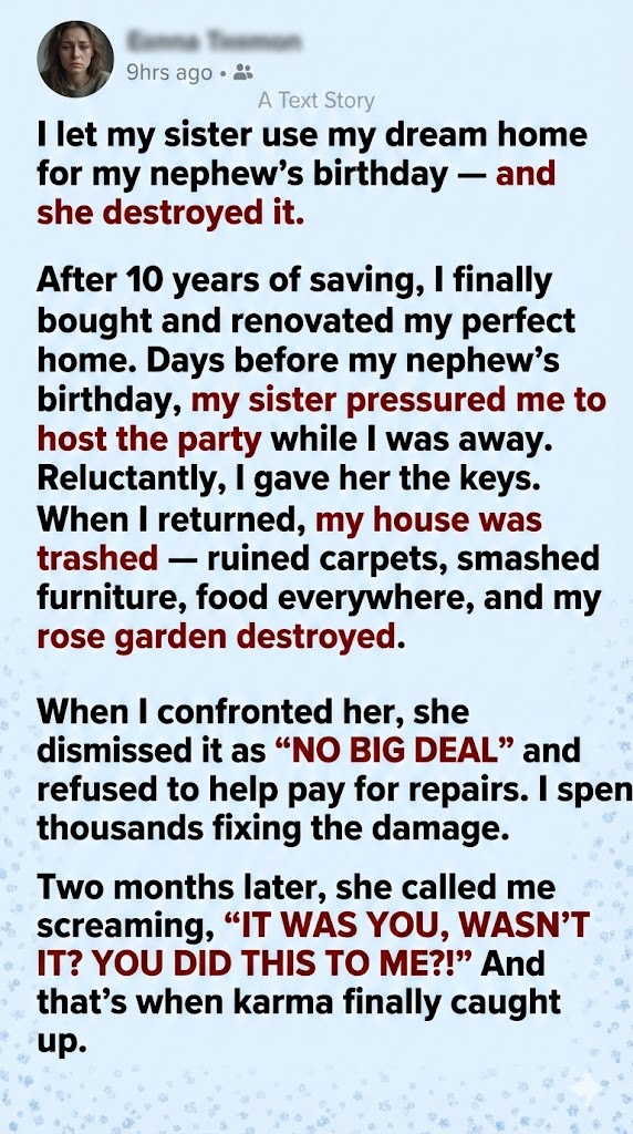 When Anna reluctantly lets her sister borrow her beloved home for her nephew’s birthday, she expects a simple celebration. Instead, she returns to devastation, betrayal, and silence that cuts deeper than any mess. But as the dust settles, Anna discovers the true cost of family, and the strength of reclaiming her sanctuary.