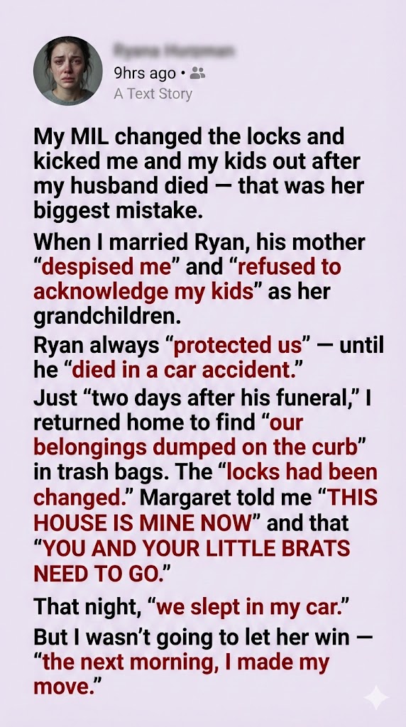 Losing my husband shattered me. But two days after his funeral, my mother-in-law made it worse. She kicked me and my kids out, changed the locks, and left us homeless. She thought she won, but she had no idea she was making the biggest mistake of her life.
