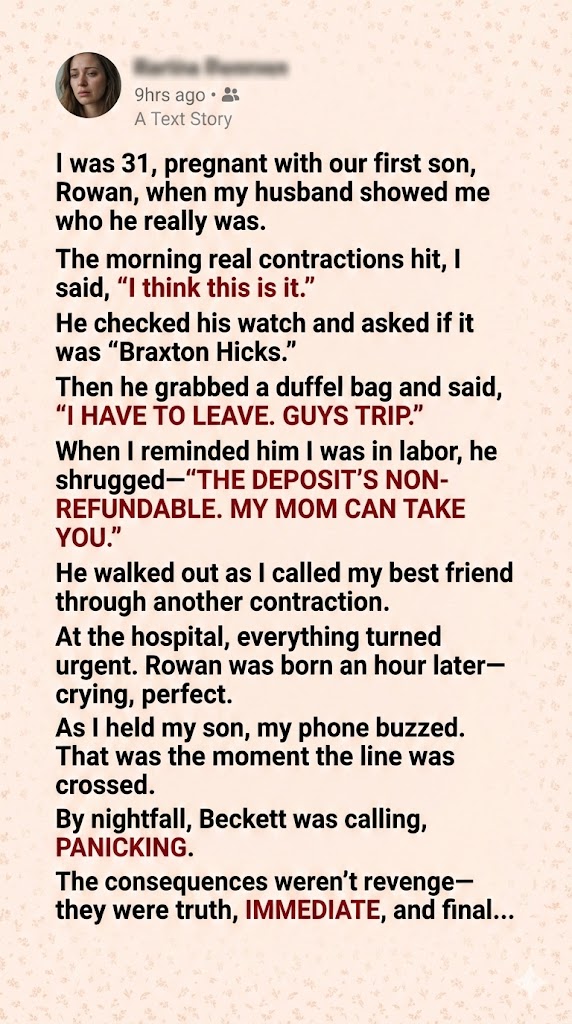 “Text me your contraction times,” she said. Her voice went flat and focused. “I’m leaving work right now. Do not drive. Do not wait for his mother.”