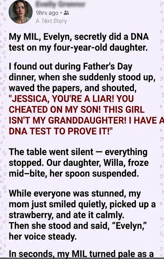 “You cheated on my son. That girl,” she stabbed the air toward Willa. “… that child is not my granddaughter. And I have a DNA test to prove it!”