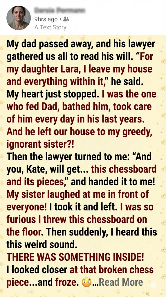 My sister got the house. I got a chessboard. At first, I thought it was my father’s final insult — until I heard something strange rattling inside one of the pieces.