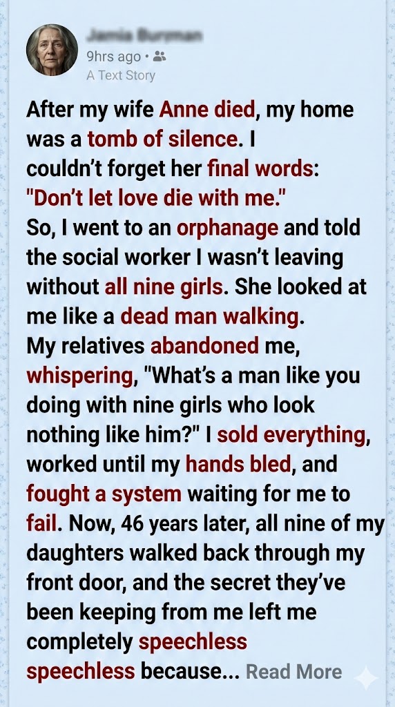 On the night the last daughter moved out, Richard sat alone holding a framed photo of the nine as toddlers, lined up like pearls on a string. He whispered, “I kept my promise, Anne.”