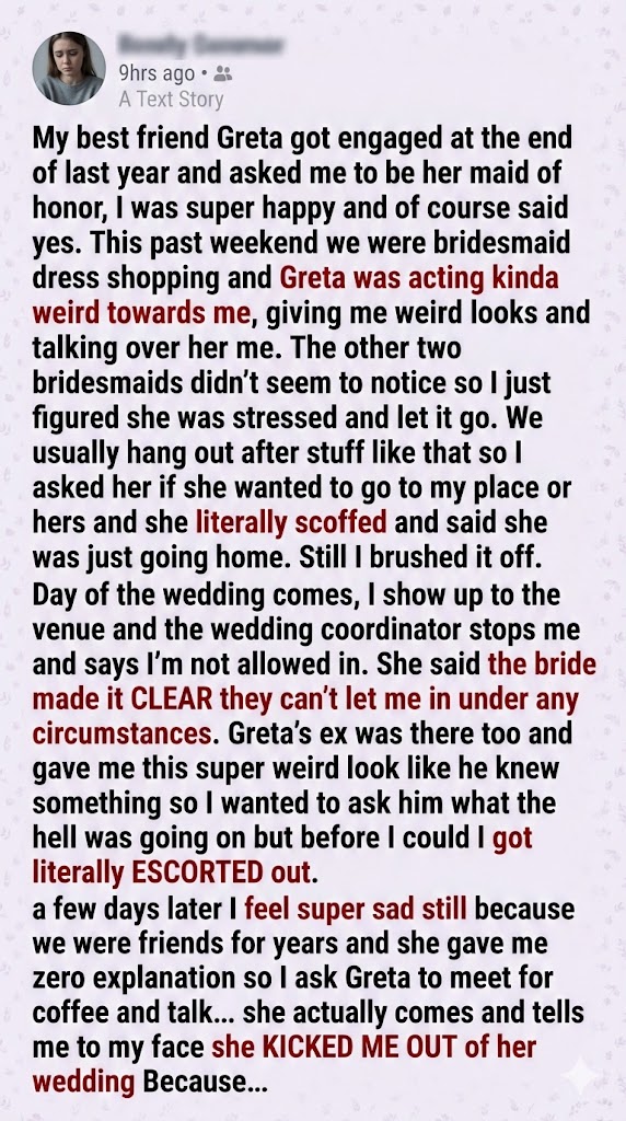“I need to know why you kicked me out of the wedding,” I said gently. “Why did you think I was trying to ruin your special day? You’re my best friend, Greta. I’d never do anything to hurt you.”