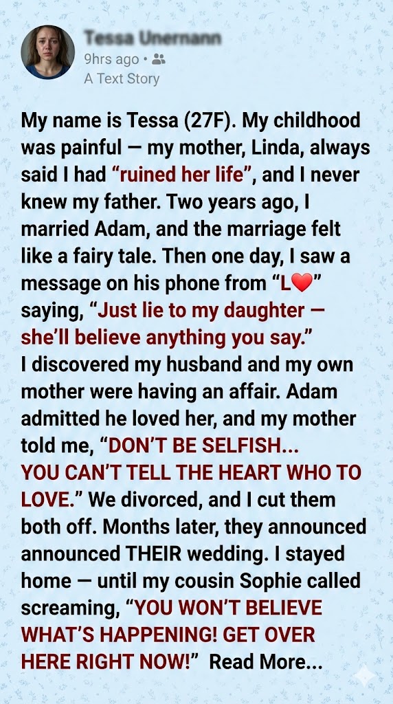 My name is Tessa. I’m 27, and if you told me five years ago that my mother would end up marrying my husband, I would’ve laughed. Not a polite laugh — a loud, gasping one, followed by a sarcastic, “Yeah, right.”