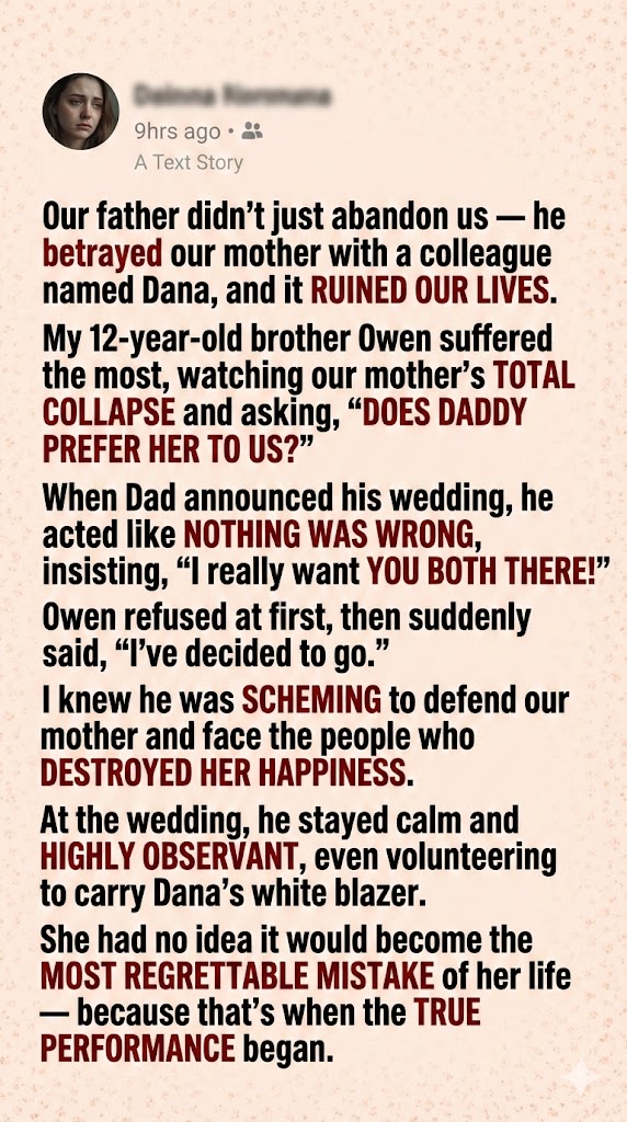 When my dad called to invite my 12-year-old brother and me to his wedding, I thought the worst part would be watching him marry the woman who destroyed our family. I had no idea my quiet little brother had been planning something that would make their special day unforgettable.