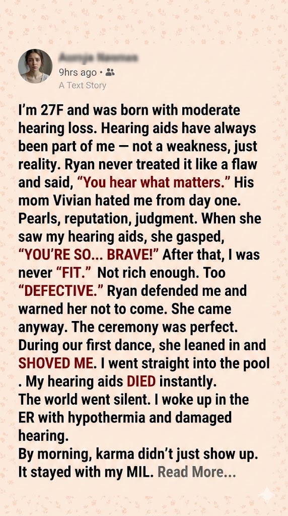 The ride to the hospital was a blur. I couldn’t hear the EMTs. I just stared at the ceiling of the ambulance, soaked and shaking, while Ryan held my hand the entire way. My body trembled from the cold, but the panic had settled deeper. Not just fear, but grief. I already knew my hearing was worse. I could feel it in the silence.
