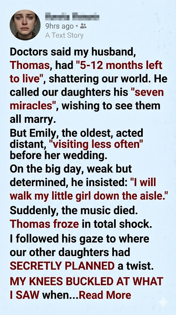 Doctors gave my husband 5–12 months to live, so every milestone feels urgent. On our oldest daughter’s wedding day, he was barely strong enough to walk her down the aisle—until the music stopped halfway and he froze, staring ahead in shock.