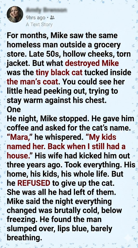 A man, Mike, walked past, but then, for some reason, he turned around. He bought a hot coffee and walked back, ignoring the rules of the invisible world. He simply asked, “Hey. Does she have a name?” I managed to rasp, my voice cracking, “Mara. My kids named her. Long time ago.” That single line—the mention of my children—it cracked something wide open inside me. Mike didn’t plan to get involved, but after that first night, he started showing up on purpose. He brought me sandwiches, gloves, and once, tuna just for Mara. I told him he didn’t have to do it, but he always replied, “I know. But I want to.”