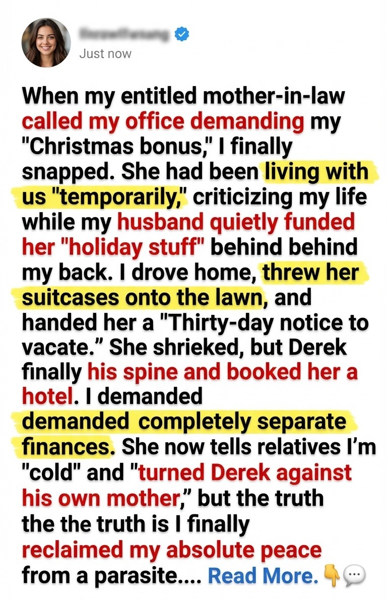 My Entitled Mother-In-Law Demanded My Entire $2,500 Christmas Bonus, So I Packed Her Bags And Evicted Her Immediately