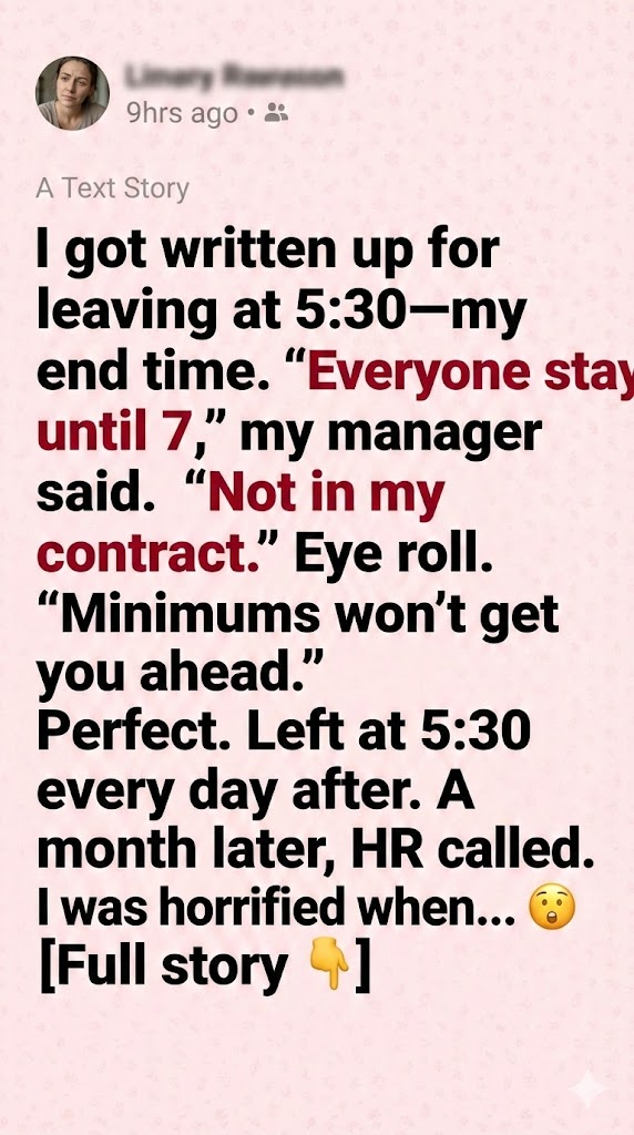 When I walked into the room, my manager was already there, wearing a smug expression, as if she’d finally caught me doing something wrong. But then HR said, “We’ve been reviewing the timesheets. Writing you up for leaving on time goes against company policy and your contract.