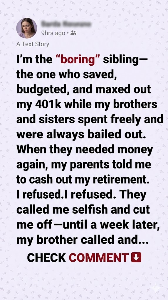 While my brother and sister hopped between jobs and spent every cent on festivals and gadgets, I worked overtime, lived on a strict budget, and maxed out my 401k. My parents always enabled them, saying I was the “responsible one” who didn’t need help.