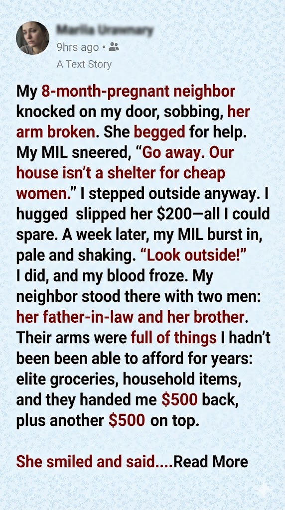 My 8-months-pregnant neighbor knocked on my door, sobbing, her arm broken. She begged for help. My mother-in-law sneered, “Go away. Our house isn’t a shelter for cheap women.”