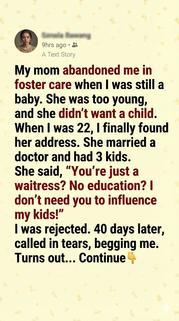 I don’t remember the day my mother left me. I was too small—just a baby handed over to strangers, a name on a file, a quiet bundle placed into foster care because the woman who gave birth to me was too young and too afraid to keep me. That’s what I was told later, anyway.