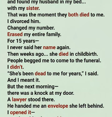 Fifteen years ago, I walked into my bedroom and saw something that split my life in two. My husband was in my bed—with my sister. I didn’t scream. I didn’t …